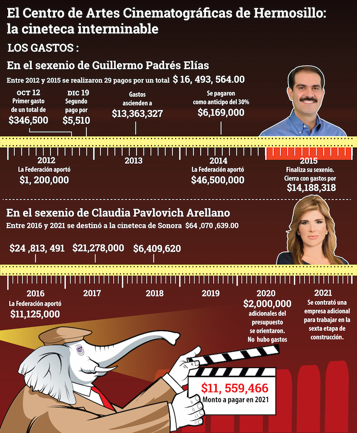 La obra, llamada Centro de las Artes Cinematográficas del Noroeste, comenzó a edificarse en el sexenio de Padrés Elías. El dinero ha provenido del Gobierno de Sonora y de la Federación, que en 2012, 2014 y 2016 hizo aportaciones al Instituto Sonorense de Cultura por un total de 68 millones 892 mil 341 pesos.