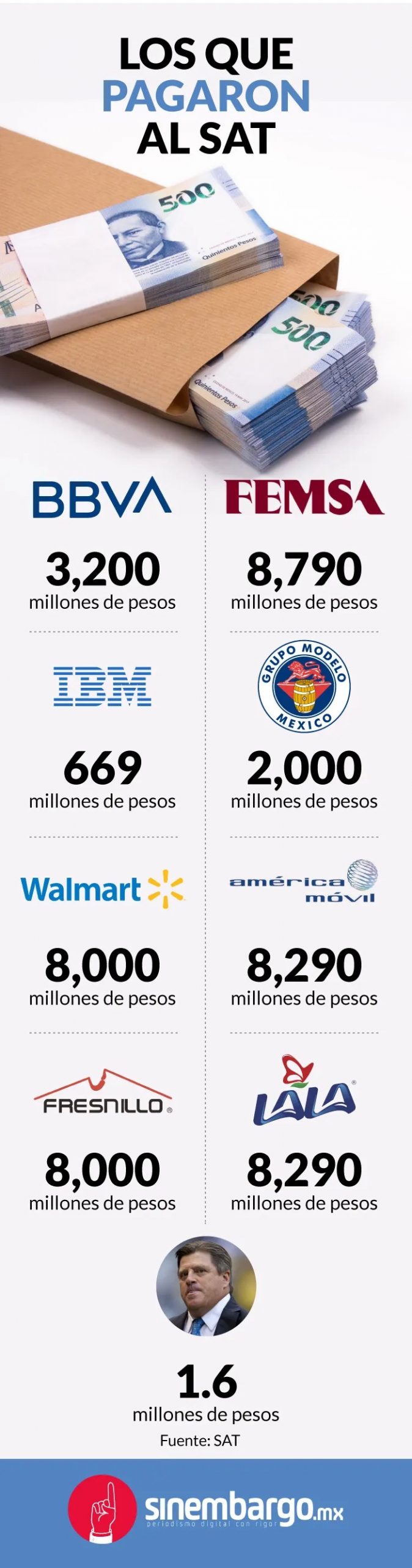 Las empresas que desde el 2020 se regularizaron con el fisco son: América Móvil, Walmart de México, Femsa, IBM de México, Minera Fresnillo, Grupo Modelo, Grupo Lala y BBVA, además de personajes como Miguel Herrera, quien fuera director técnico del Club América y la Selección Nacional de futbol.