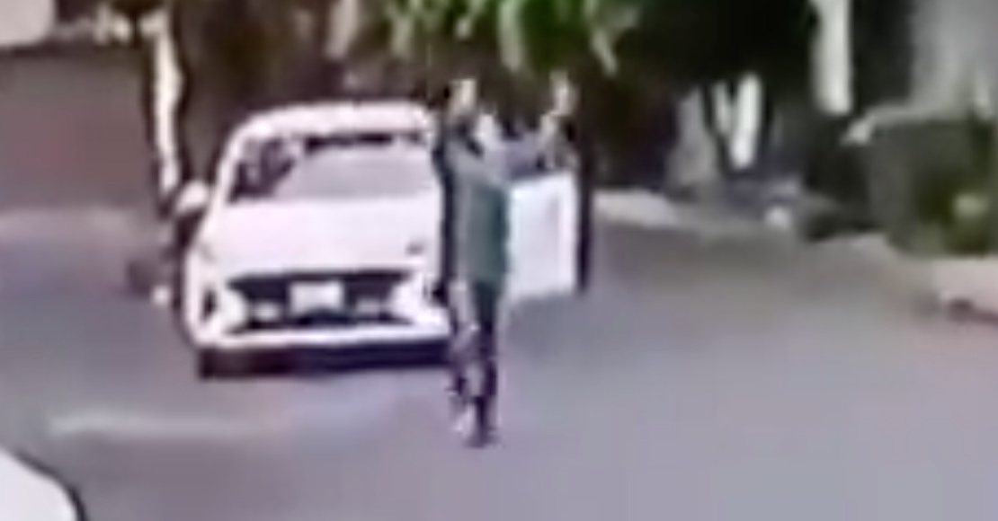 Entonces, se puede apreciar en las imágenes de seguridad cómo el chofer sale del automóvil, tomándose la cara, claramente afectado y dando tumbos. Ambas puertas traseras del coche blanco se abren y salen dos personas, imposibles de identificar debido a la calidad de las imágenes.