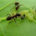 Las hormigas pueden convertirse en plaga porque los pulgones las protegen en sus nidos y luego las llevan a las plantas, al recogen la melaza que excretan cuando los pulgones se alimentan de la savia de los vegetales. Las hormigas defienden estas plagas de depredadores también. La manera más sencila de romper el ciclo es aplicarles a las hormigas un cebo tóxico que no las mata al instante, pero que llevan de regreso a su nido, alimenta al resto de las hormigas y poco a poco destruye a la colonia entera. El bórax es una sal mineral natural, pero es tóxico cuando se ingiere, por lo que no se recomienda su uso cerca de niños y mascotas.