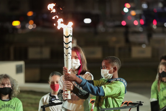 Durante la ceremonia que marca el paso del testigo, dos menores, alumnos de una villa olímpica municipal, encendieron el pebetero ante el alcalde de Río de Janeiro, Eduardo Paes, y el cónsul general de Japón Ken Hashiba.
