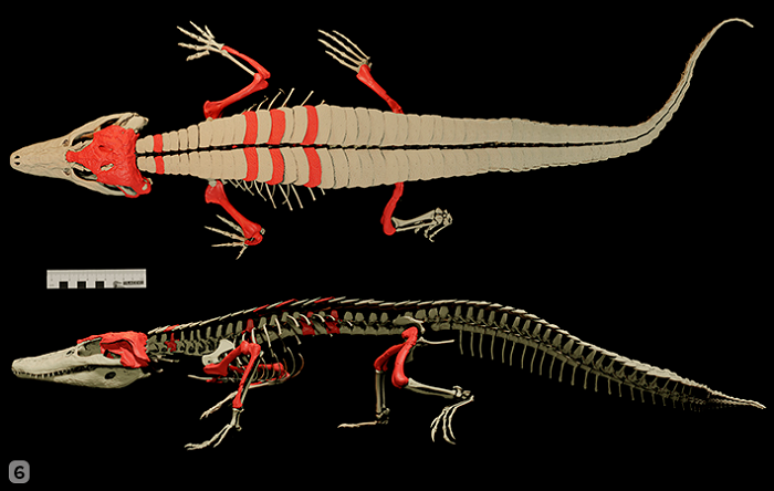 Según los investigadores, el pequeño reptil de no más de 70 centímetros de largo ahora ocupa un lugar clave en la historia de estos animales, como lo revela la estructura de su cráneo y de sus patas traseras.