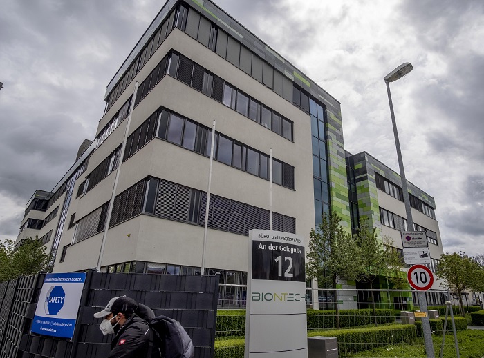 En esta fotografía del 6 de mayo de 2021 un hombre con una mascarilla sale de la sede de la farmacéutica alemana BioNTech en Mainz, Alemania. Foto: Michael Probst, AP