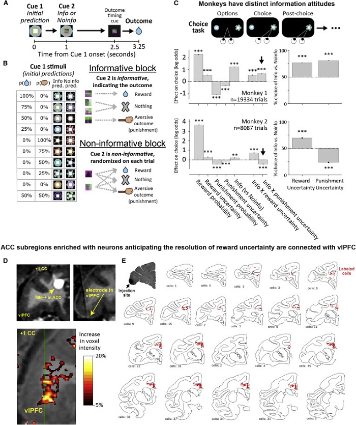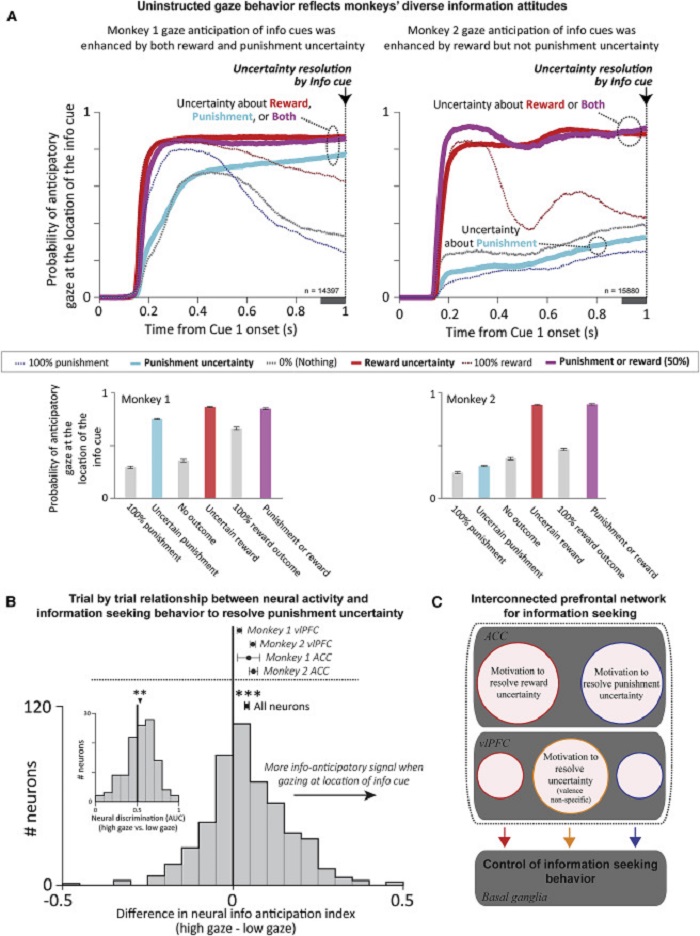 En 2019, estudiando a los monos, los miembros del laboratorio de Monosov, el doctor J. Kael White, que entonces era estudiante de posgrado, y el científico principal, el doctor Ethan S. Bromberg-Martin, identificaron dos áreas cerebrales implicadas en el seguimiento de la incertidumbre sobre los acontecimientos anticipados positivamente, como las recompensas. La actividad en esas áreas impulsó la motivación de los monos para encontrar información sobre cosas buenas que podrían ocurrir.