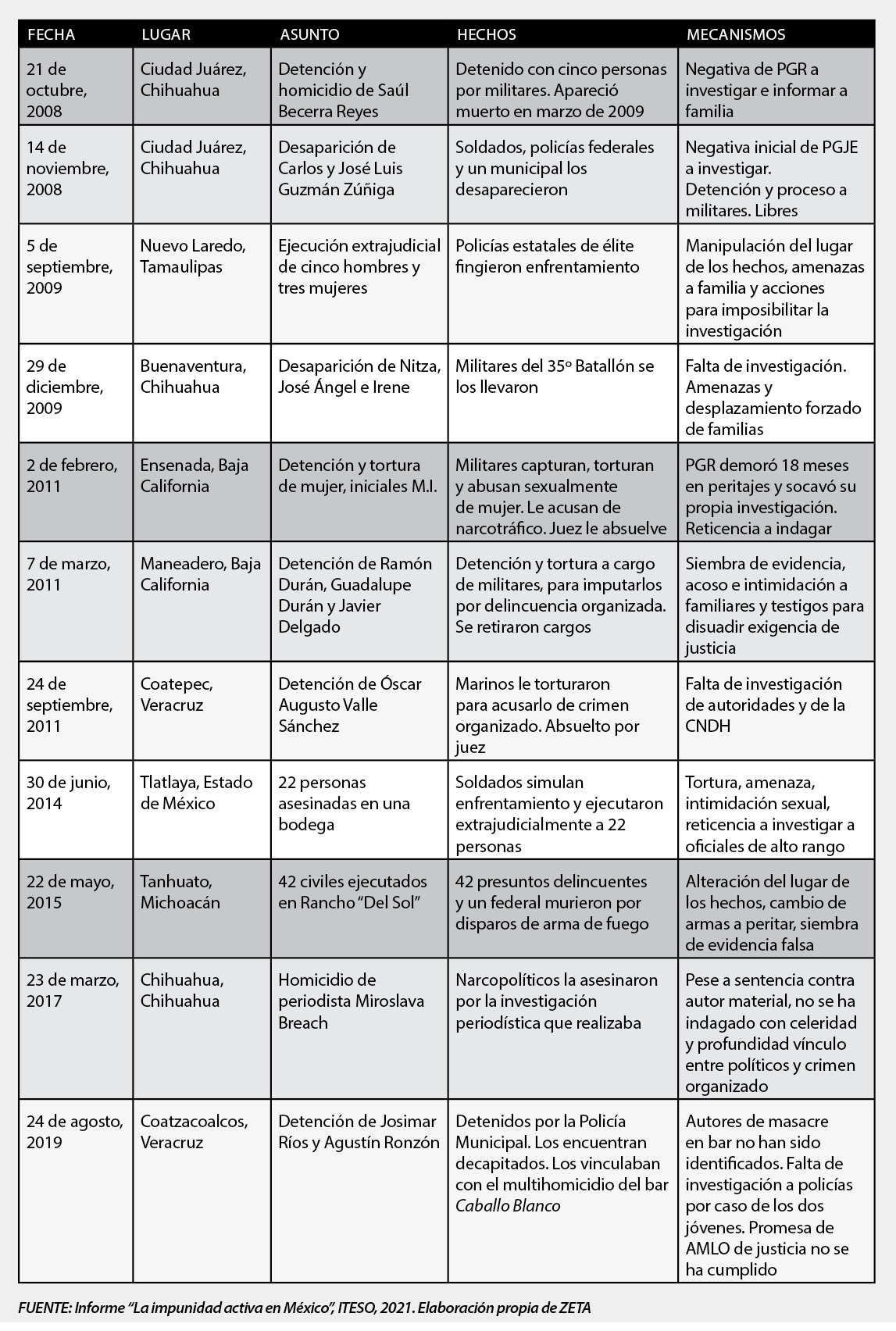 Entre los once casos analizados por los investigadores, se encuentra la ejecución extrajudicial de 22 personas en Tlatlaya, Estado de México, en marzo de 2014; la masacre de 42 civiles y un agente federal en Tanhuato, Michoacán en mayo de 2015; y las incompletas y fallidas investigaciones del homicidio de la periodista Miroslava Breach con relación a los narcopolíticos de Chihuahua, en marzo de 2017. Aunque también figuran dos pesquisas de habitantes de Ensenada y Maneadero, Baja California, que en 2011 fueron detenidos y torturados por militares, sin que hallaran justicia a sus causas.