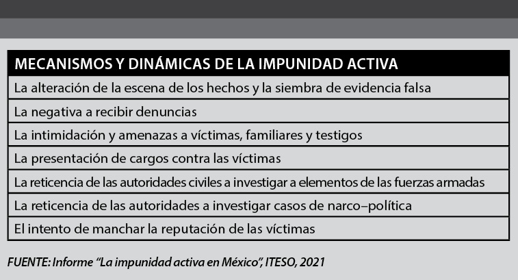 En esos y otros casos que ocurrieron desde 2008 hasta 2019, durante los sexenios de los presidentes Felipe Calderón Hinojosa, Enrique Peña Nieto y Andrés López Obrador, los académicos identificaron los mecanismos que generan la impunidad activa, como la alteración de la escena de los hechos y la siembra de evidencia falsa; la negativa a recibir denuncias; la intimidación y amenazas a víctimas, familiares y testigos.