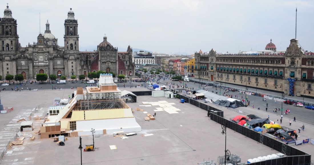 Alumbrado instalado en el Zócalo de la Ciudad de México para conmemorar los "500 años de Resistencia Indígena". Foto: Galo Cañas, Cuartoscuro