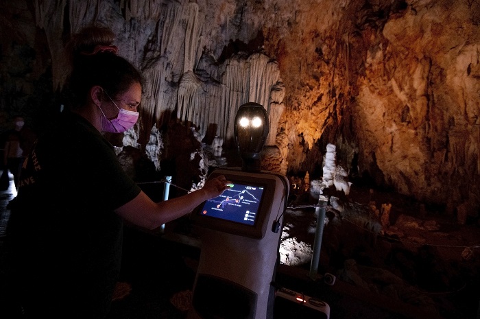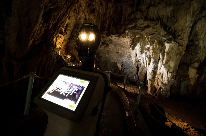 El robot se mueve a lo largo de una pasarela, atravesando un paisaje ornamentado de estalactitas y estalagmitas. Estas variadas formaciones pueden alcanzar 15 metros (50 pies) de altura y se ven a lo largo de la pasarela de casi un kilómetro (1.6 millas) de la cueva, que es accesible para personas con movilidad reducida.