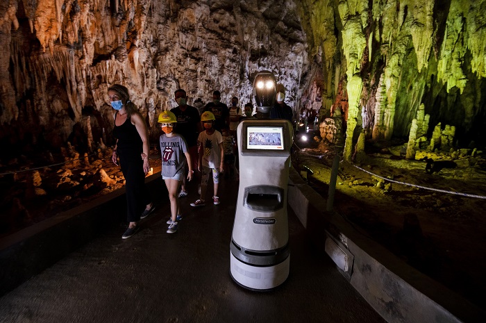 El robot multilingüe cubre los primeros 150 metros (aproximadamente 500 pies) de la parte de la cueva que está abierta al público. En los 750 metros restantes, un guía humano se hace cargo.