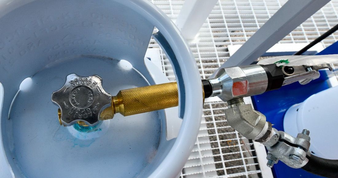 En el andén de llenado de recipientes portátiles de la Terminal de Distribución de Gas Licuado de Tepeji del Río, el director general de Pemex realizó la carga del primer cilindro de gas de 20 kilos del primer lote que se tiene previsto para el arranque de Gas Bienestar.