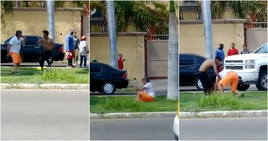 Los hechos ocurrieron en las calles de Quintana Roo y Náinari, en el municipio de Cajeme, en Sonora, cuando un hombre maduro que vestía playera blanca y short anaranjado dejó su coche estacionado para pelearse a golpes con otro sujeto más joven que no tiene playera.