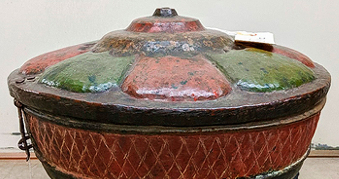 Además tiene "motivos diversos de pétalos verdes y naranjas; contiene una tapa y un cerrojo de hierro remachado en forma de lágrima, cuyo uso principal se dio en el siglo XIX, como receptáculo de agua bendita en la antigua Misión de Caborca".