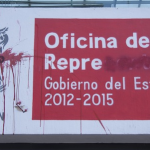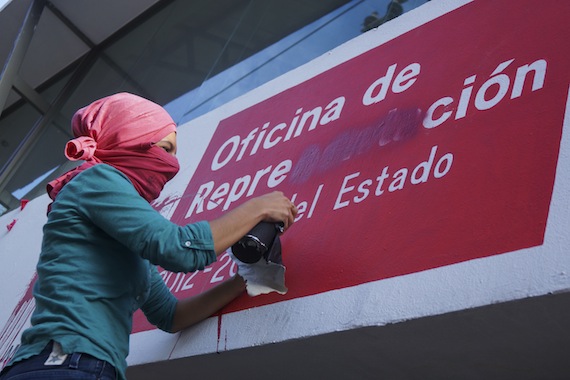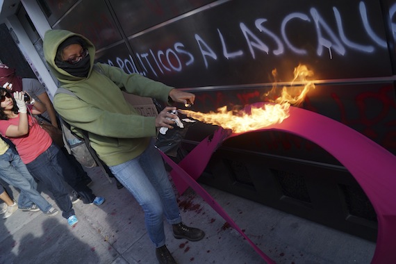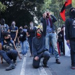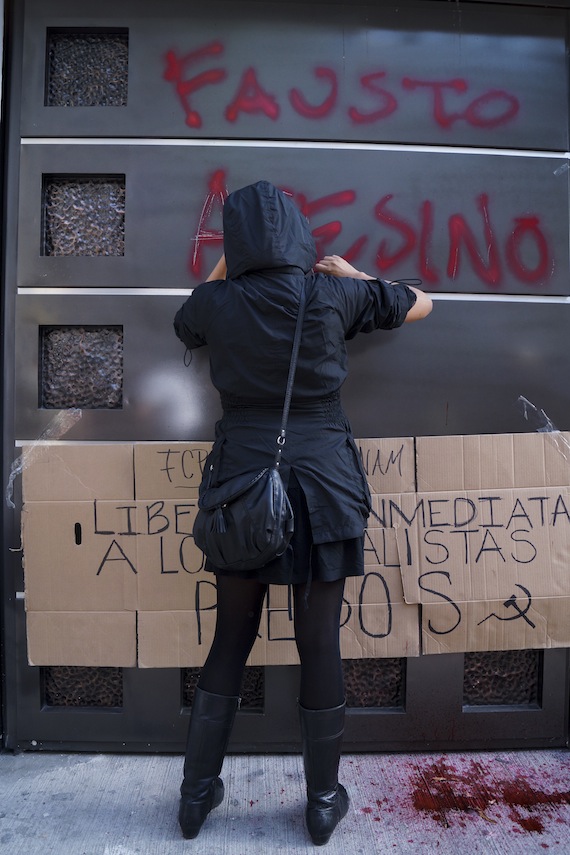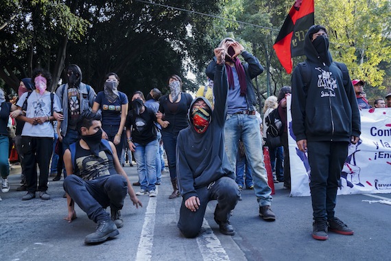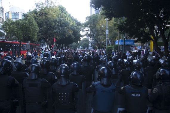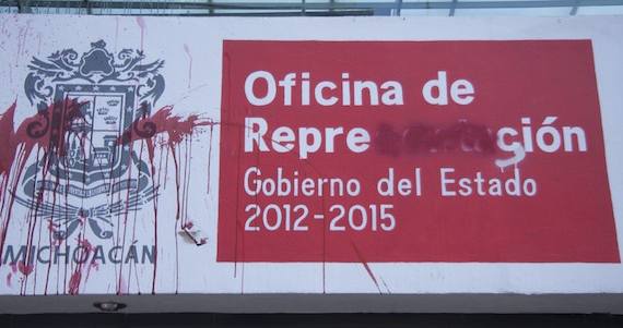 Decenas de personas se manifestaron afuera de la representación del estado de Michoacán, ubicada en la colonia Nápoles, para pedir la liberación de los normalistas detenidos el pasado lunes en ese estado en un desalojo de las Normales.