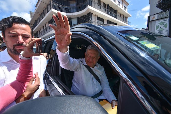 A la llegada de López Obrador al Teatro de la Ciudad “Junchavín”, por el evento de conmemoración del Bicentenario de la Independencia de Chiapas, el mandatario bajó del vehículo y ofreció un saludo rápidamente para entrar a las instalaciones.