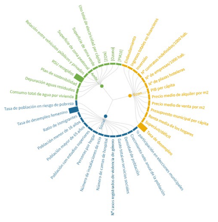 Para ello, hemos partido de más de 100 indicadores que promueven instituciones como la ONU y la UE. De ellos, hemos evaluado y cuantificado 38 (figura 2). Al aplicarlos sobre 31 ciudades españolas representativas de más 50 mil habitantes, se ha podido establecer que los tres indicadores que dibujaban la imagen más aproximada (85 por ciento de precisión en la predicción) sobre la sostenibilidad que se obtenía con el análisis global fueron: