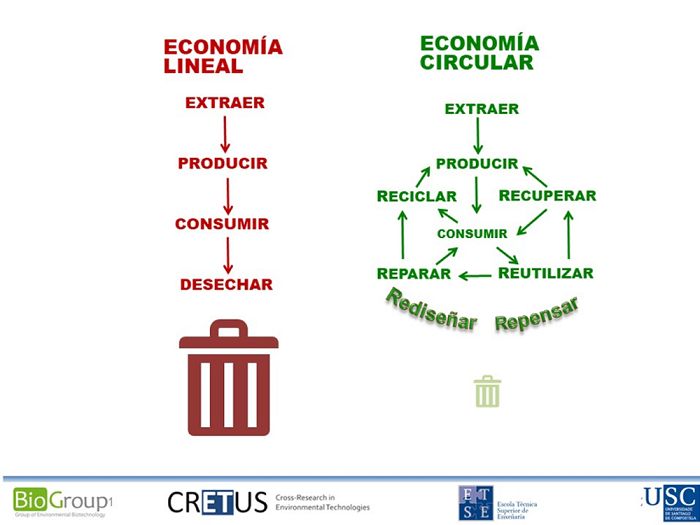 - Eje ambiental: generación de residuos. La cantidad de residuos, en kilogramos, que un habitante de la ciudad genera en un año debe ser menor de 423 kg. Este hecho está directamente relacionado con la apuesta por la economía circular (figura 3). Lo trascendente es minimizar la generación de residuos, pues implica: repensar nuestro modelo de consumo, ajustando la adquisición de los bienes de consumo a las necesidades reales, con la consecuente reducción de materia y energía derivada de la generación, utilización y procesado de productos; luchar contra el cambio climático con una menor emisión indirecta de gases de efecto invernadero; reutilizar y reparar los bienes de consumo, aumentando su vida útil.