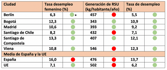 En la tabla que sigue a este párrafo se adjunta valores de los tres indicadores considerados para diversas ciudades y su comparación con la media de la UE y de España en el año 2019. Estos parámetros están disponibles en las páginas web de cada ciudad, de institutos de estadística de cada país o de organismos internacionales como el Banco Mundial.