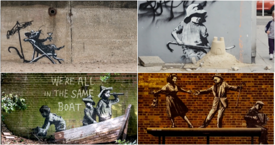 Bansky, que nunca ha confirmado su identidad completa, comenzó su carrera pintando edificios en Bristol, Inglaterra, y ha llegado a ser uno de los artistas más conocidos del mundo. Sus imágenes traviesas y a menudo satíricas incluyen a dos policías besándose, policías antidisturbios armados con caritas sonrientes amarillas y un chimpancé con un cartel que dice: “Ríete ahora, pero un día yo estaré a cargo”.