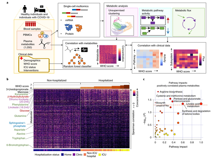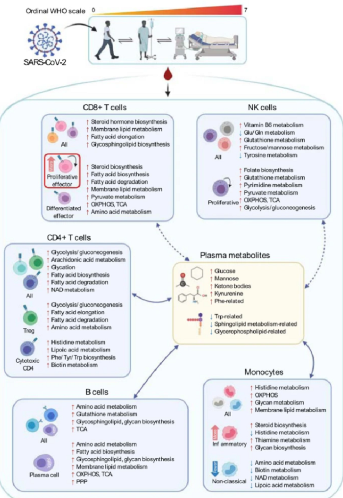 A medida que se desarrolla COVID-19 en los pacientes, se manifiestan cambios metabólicos drásticos en la respuesta inmunitaria periférica y se pueden disecar por tipo de célula. Además, estas diversas alteraciones metabólicas pueden estar relacionadas con cambios en los niveles de metabolitos plasmáticos. Foto: Lee, J.W., Su, Y., Baloni, P. et al. Integrated analysis of plasma and single immune cells uncovers metabolic changes in individuals with COVID-19. Nat Biotechnol (2021).