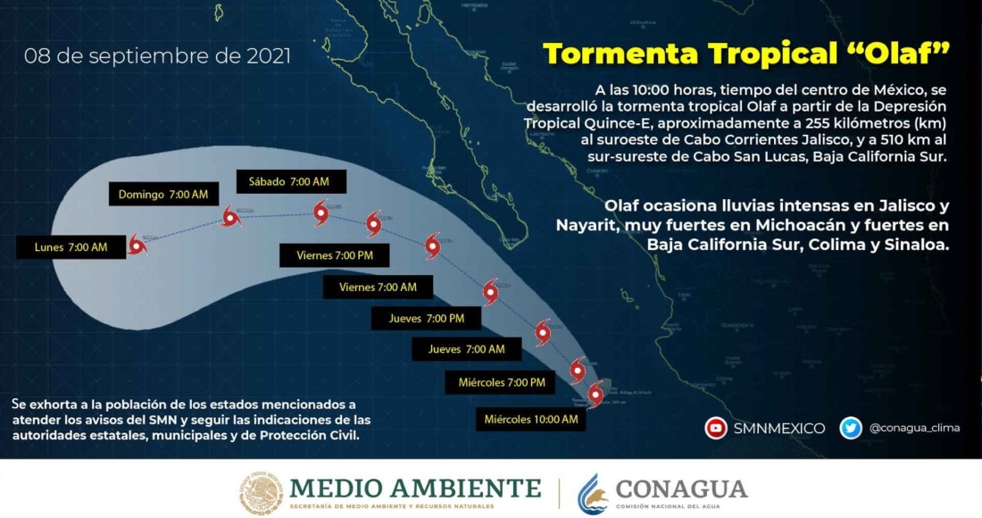 "Olaf" ocasionará lluvias muy fuertes con precipitaciones puntuales intensas (75 a 150 mm) en Nayarit y Jalisco; lluvias fuertes con lluvias puntuales muy fuertes (50 a 75 mm) en Michoacán; e intervalos de chubascos con lluvias puntuales fuertes (25 a 50 mm) en Baja California Sur, Sinaloa y Colima.