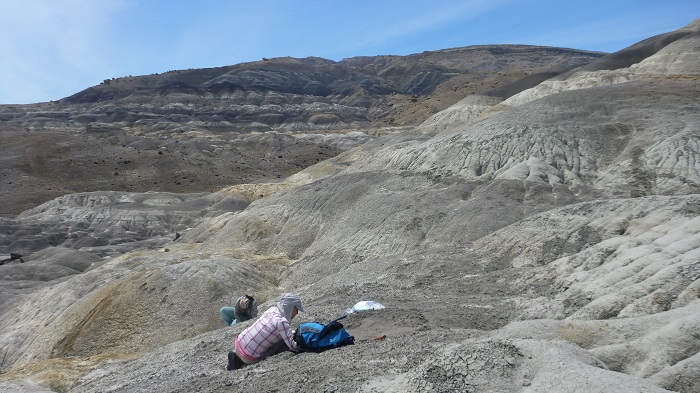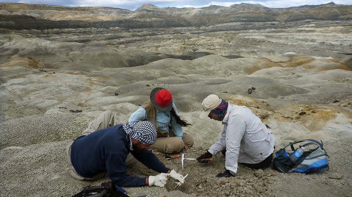 Fotografía cedida por Ariana Paulina-Carabajal que muestra a unos investigadores que trabajan recolectando huesos diminutos de diversos dinosaurios, en la formación geológica Cerro Fortaleza, en la provincia sureña de Santa Cruz (Argentina). Foto: EFE/Ariana Paulina-carabajal