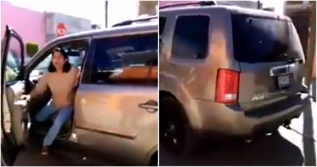Las imágenes muestran el momento en que una, quien vestía con short y playera negra, trata de empujar la camioneta sin éxito.