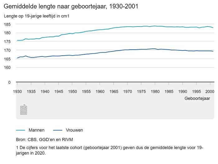 Los resultados del organismo indican que la generación de los hombres neerlandeses de 19 años tienen una estatura promedio de 182.9 centímetros, mientras que las mujeres del mismo grupo etario miden aproximadamente 169.3 centímetros. Mientras, los hombres y las mujeres nacidos en la década de los 80 son en promedio uno y 1.4 centímetros más altos, respectivamente.