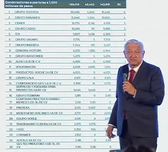 El documento de Andrés Manuel señaló que las empresas y grupos bancarios más beneficiados por la condonación de impuestos en las últimas dos administraciones fueron las siguientes: