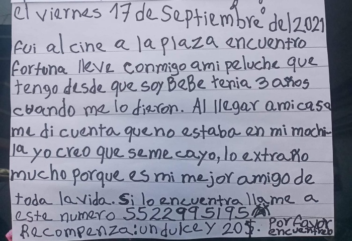 En el cartel, Miranda escribió "Fui al cine a la Plaza Encuentro Fortuna, llevé conmigo a mi peluche que tengo desde que soy bebé, tenía tres años cuando me lo dieron. Al llegar a mi casa me di cuenta que no estaba en mi mochila, yo creo que se me cayó, lo extraño mucho porque es mi mejor amigo de toda la vida".
