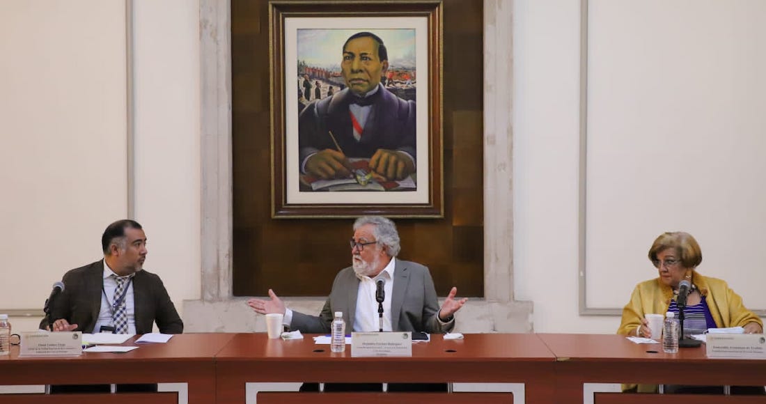 El Subsecretario de Gobernación, Alejandro Encinas; el titular de la Unidad Especial de Investigación y Litigación para el caso Ayotzinapa de la Fiscalía General de Justicia (FGR), Omar Gómez, y el camión de los normalistas, llegaron a Palacio Nacional para el encuentro del séptimo aniversario de la desaparición de los estudiantes.