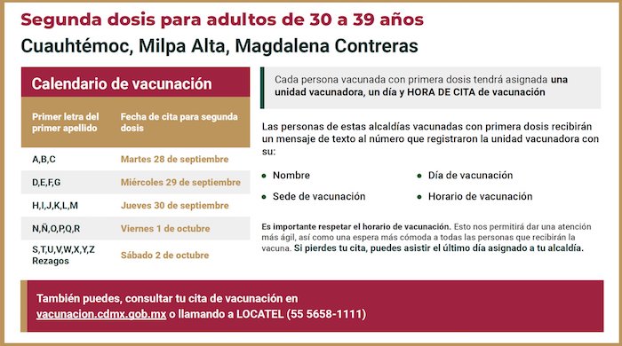 En la Fase 30 del Plan Nacional de Nacional de Vacunación en la capital mexicana se aplicarán también segundas dosis AstraZeneca para la población de 30 a 39 años de Cuauhtémoc, Magdalena Contreras y Milpa Alta. Eso del martes 28 de septiembre al sábado 2 de octubre.