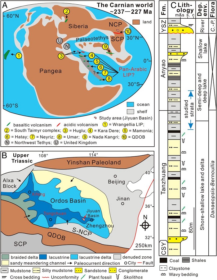 Para llegar a estas conclusiones, los autores del estudio analizaron registros de sedimentos y plantas fósiles de un lago en la cuenca de Jiyuan, en el norte de China, y determinaron que las firmas químicas en los sedimentos sugerían episodios de vulcanismo y se correlacionaban con los cambios ambientales del llamado Episodio Pluvial Carniano (CPE, por sus siglas en inglés). Esta fue una crisis global que tuvo lugar durante la etapa del Triásico tardío (cuando las masas terrestres aún estaban unidas en el supercontinente Pangea) y consistió en "megamonzones" de lluvias intensas, así como aumentos de la temperatura y la humedad globales, provocados por la liberación de gases de efecto invernadero.