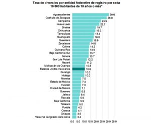 Por otro lado, las entidades que registraron las mayores tasas de divorcios por cada 10 mil habitantes de 18 años o más, fueron Aguascalientes con 30.6, Coahuila de Zaragoza con 28.8 y Campeche con 23.9, mientras que la tasa nacional fue de 10.6 por ciento. En tanto, las menores tasas correspondieron a Veracruz de Ignacio de la Llave (3.4), Chiapas (3.5) y Oaxaca (4.1).