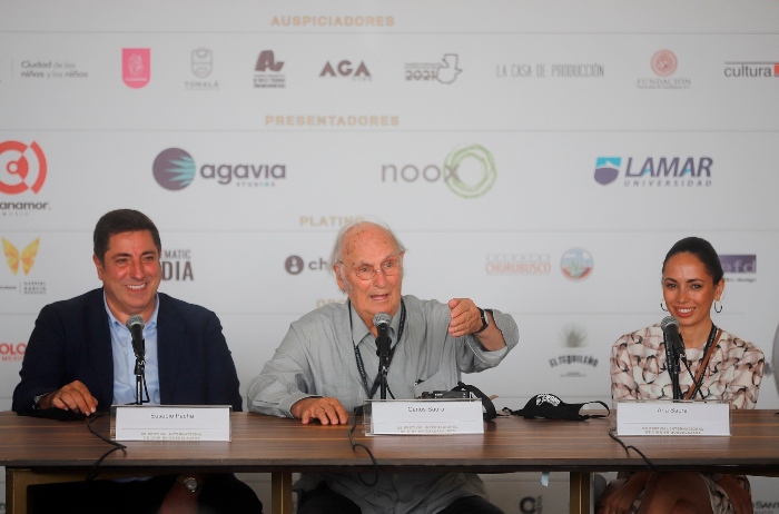 El productor Eusebio Pacha (i), el director español de cine Carlos Saura (c) y la coproductora Ana Saura, participan en una rueda de prensa del Festival Internacional de Cine en Guadalajara, estado de Jalisco. Foto: EFE/Francisco Guasco.