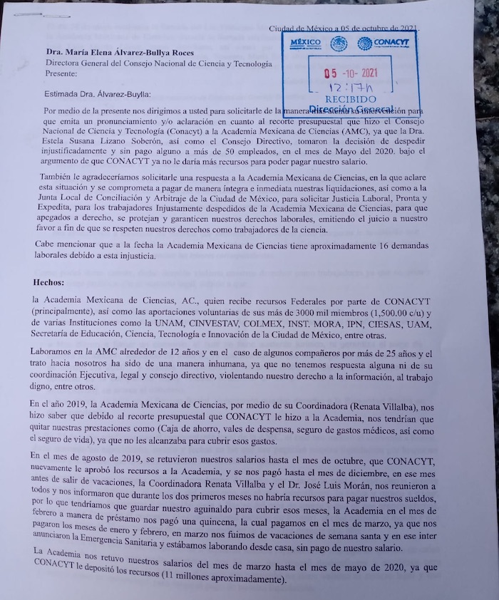 En la carta dirigida a la directora de Conacyt se le solicita que exija una respuesta a la Academia Mexicana de Ciencias, en la que se comprometa a pagar de manera íntegra e inmediata sus liquidaciones.
