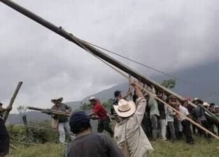 Pobladores cooperaron con personal de la CFE para levantar los postes de luz. Foto: Consejo Regional Totonaco.