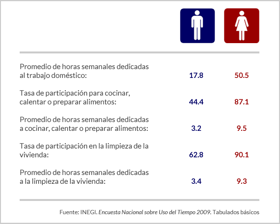 Pese al incremento de hombres mexicanos en casa, el tiempo que ellos se involucran en los quehaceres del hogar continúa siendo bajo. Según resultados de la Encuesta Nacional Sobre Uso de Tiempo realizada por el INEGI en 2009, las mujeres dedican en promedio 50.5 horas a la semana a las tareas del hogar; los hombres sólo destinan 17.8 horas.