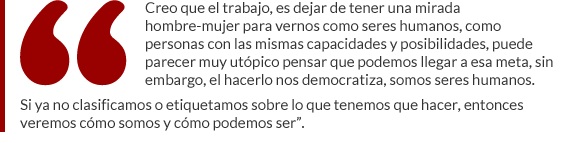 Hombres y mujeres tenemos un largo camino por explorar y recorrer de manera distinta; todo puede ser redefinido, negociado, debemos tener empatía y dejar de vernos como rivales. La académica finaliza: “Somos seres humanos  conviviendo, es mejor dejar la rivalidad para las competencias deportivas y para lo cotidiano, la ciencia, el arte y el trabajo debemos unir fuerzas”.