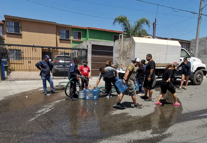 En algunas colonias de Tijuana y Ensenada, a las que no llega el suministro de agua por fallas en el sistema hidráulico, el gobierno del estado entrega agua con la ayuda de pipas. Foto: CESPT.