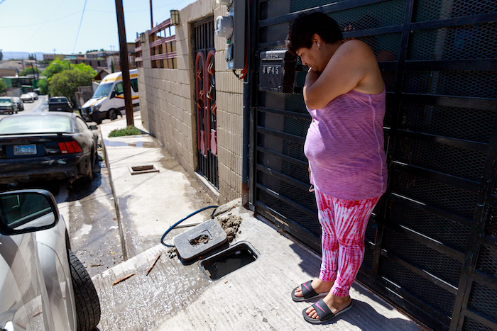 Una vecina de la colonia Ampliación Gabriel Rodríguez, en Tijuana, observa una fuga de agua en el medidor de la tubería de agua potable. La fuga llevaba ocho horas sin que llegara nadie a repararla. En esta colonia escasea el agua durante varios días a la semana. Foto: Eduardo Jaramillo.