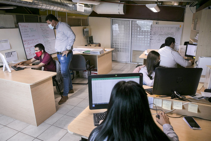 Empleados de la empresa Fisamex analizan la documentación de las empresas, para calcular las deudas de agua que tienen y elaborar un dictamen, dentro de las instalaciones de las comisiones del agua. Foto: Eduardo Jaramillo.