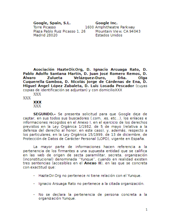 Mediante solicitud judicial, HazteOir reclamó a Google que “admitiera y procediera” a eliminar los contenidos del motor de búsqueda, abonar compensaciones en dinero al grupo y firmar un acuerdo de confidencialidad, “de tal forma (que) las entidades requeridas (Google Inc. y Google España) no podrán dejar constancia pública de la ocultación, informar a terceros o, ni a priori ni a posteriori, a las web de origen”, entre ellas los medios de comunicación.