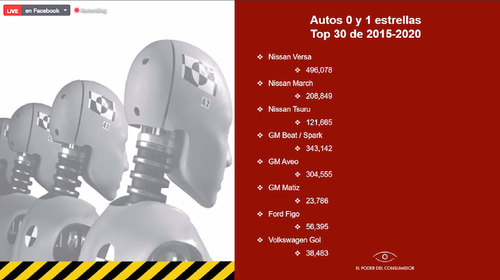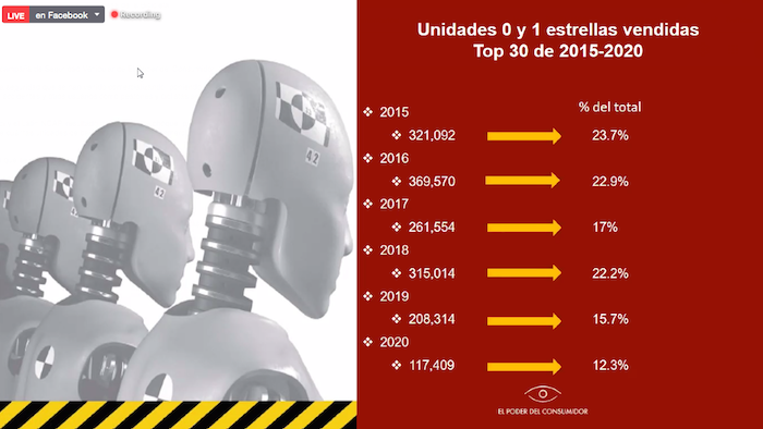 Para este informe, que analiza el periodo 2015 a 2020, la organización El Poder del Consumidor, en conjunto con Latin NCAP, retomaron el acumulado de ventas del registro administrativo de la industria automotriz de vehículos ligeros del Instituto Nacional de Estadística, Geografía e Informática (Inegi) se constató que 1.5 millones de automóviles fueron calificados con 0 y 1 estrellas en su evaluación de desempeño de seguridad en Latin NCAP, y que, de acuerdo con su pobre resultado en protección tanto para ocupantes adultos como infantiles, representan, actualmente, un riesgo elevado para la población.