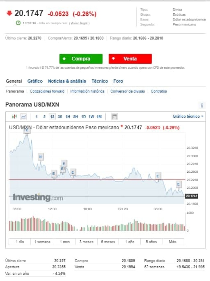 El tipo de cambio se encontraba tocando un mínimo de 20.1980 y un máximo de 20.2812 pesos por dólar.