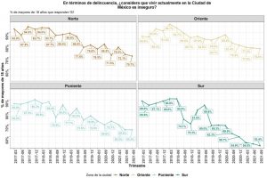 El estudio señala que todas las zonas de la capital registraron niveles mínimos en la percepción de inseguridad, siendo la zona oriente la que reporta una mayor percepción (76.8 por ciento), seguida por la norte (70.7 por ciento), poniente (65.5 por ciento) y sur (52.4 por ciento). Dicha tendencia a la baja se observa en todas las zonas de la capital de la República a partir del tercer trimestre de 2019.