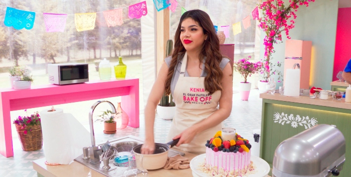 En el primer capítulo, la influencer y cantante Kenia Os se luce con un vistoso pastel de tres leches que para hidratarse requiere sacar un vaso encajado en el medio del bizcocho.