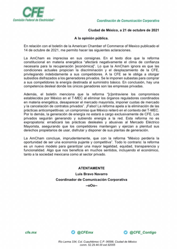 Ciudad de México, 22 de octubre (SinEmbargo).-- La Comisión Federal de Electricidad (CFE) dijo que la American Chamber of Commerce (AmCham) de Mexico se equivoca al asegurar que la nueva Reforma Eléctrica del Presidente Andrés Manuel López Obrador afectará el clima de confianza para la recuperación económica, como lo hizo ver el pasado 14 de octubre por medio de un posicionamiento.