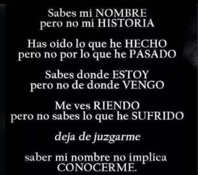 “Deja de juzgarme, saber mi nombre no implica conocerme”, publicó la modelo mexicana, en un primer mensaje. “Yo vine a esta vida a ser feliz y no complacer a nadie más; pero si poder hacer lo mejor por alguien”, destacó en un segundo mensaje.