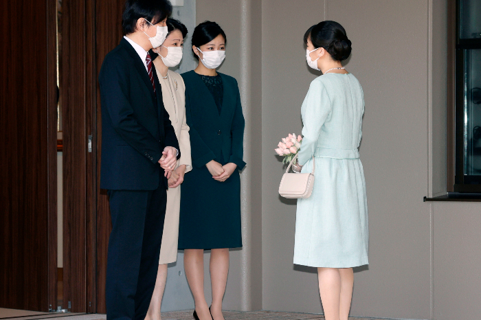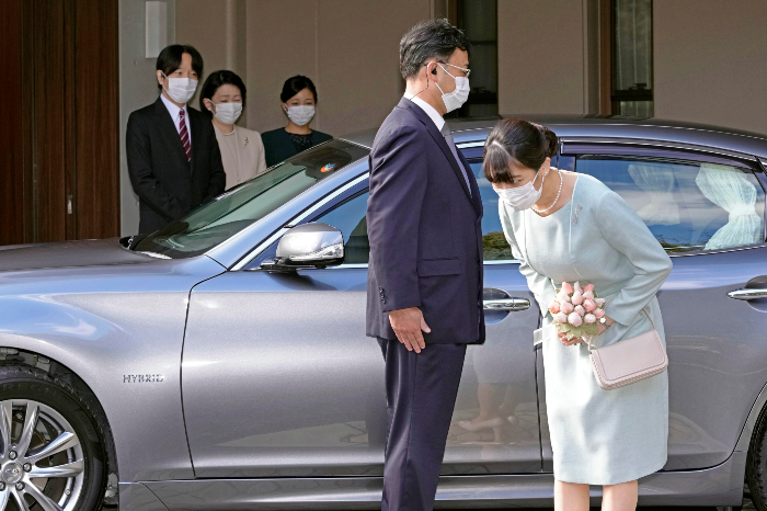Mako salió de palacio el martes por la mañana con un vestido azul claro y un ramo de flores. Ante la residencia familiar se inclinó ante sus padres, el príncipe heredero Akishino y la princesa heredera Kiko, y su hermana Kako, y después las hermanas se abrazaron.