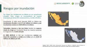Añadió que actualmente el daño anual esperado (DAE) en México por inundaciones fluviales es de siete mil millones de dólares y por las costeras, de 130 millones de dólares. Además, se cree que Tamaulipas, Veracruz y San Luis Potosí tendrán los mayores niveles de riesgo.